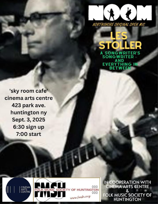 Les Stoller will be the featured performer at the NorthShore Original Open Mic (NOOM) on Wednesday, September 3. Co-presented by the Cinema Arts Centre and the Folk Music Society of Huntington in the Cinema’s Sky Room (423 Park Avenue, Huntington), the open mic runs from 7-9:30 p.m., with a featured artist performing a 30-minute set beginning around 8:30 p.m.  Sign-up starts at 6:30 p.m.  Although NOOM is free to attend, donations will be gratefully accepted.  The event will also be livestreamed via the Northshore Original Open Mic Facebook group.
