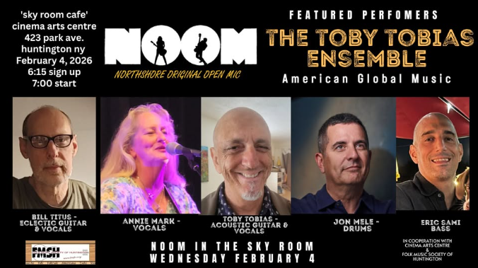 The Toby Tobias Ensemble will be the featured performer at the NorthShore Original Open Mic (NOOM) on Wednesday, February 4. Co-presented by the Cinema Arts Centre and the Folk Music Society of Huntington in the Cinema’s Sky Room (423 Park Avenue, Huntington), the open mic runs from 7-9:30 p.m., with a featured artist performing a 30-minute set beginning around 8:30 p.m. Sign-up starts at 6:30 p.m. Although NOOM is free to attend, donations will be gratefully accepted. The event will also be livestreamed via the Northshore Original Open Mic Facebook group.