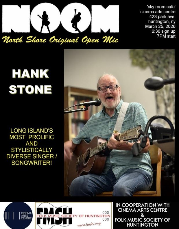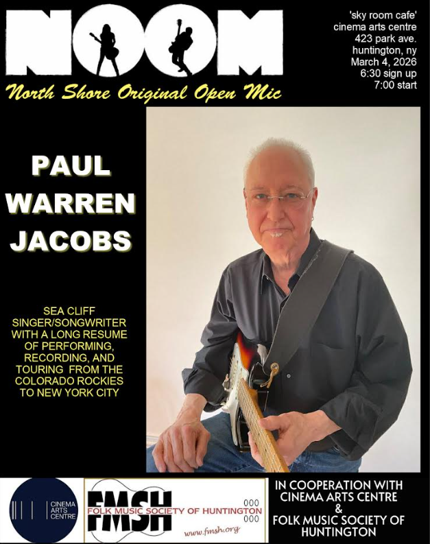 Paul Warren Jacobs will be the featured performer at the NorthShore Original Open Mic (NOOM) on Wednesday, March 4. Co-presented by the Cinema Arts Centre and the Folk Music Society of Huntington in the Cinema’s Sky Room (423 Park Avenue, Huntington), the open mic runs from 7-9:30 p.m., with a featured artist performing a 30-minute set beginning around 8:30 p.m. Sign-up starts at 6:30 p.m. Although NOOM is free to attend, donations will be gratefully accepted. The event will also be livestreamed via the Northshore Original Open Mic Facebook group.